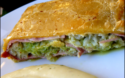 Étalez votre pâte feuilletée, piquez-la avec une fourchette. Disposez les tranches de jambon sur la pâte. Par dessus, étalez les miettes de poisson et la purée de courgettes. Et Roulez.