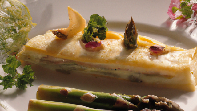Cuire les asperges coupées en morceaux dans un peu de bouillon de poulet. Cuire les oeufs dans l'eau bouillante(10 min). Cuire les pétoncles marinés dans un peu de beurre. Chauffer au four les pates feuiletées.