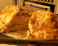 - 3Le feuilleté :Emincer les échalotes et tomber les au beurre, puis ajouter les blancs de poireaux émincés jusqu'à cuisson compléte des légumes.Emincer le filet de poisson et mélanger le riz avec l'aneth haché.Sur une abaisse de feuilletage, ranger par couche le riz puis le poisson assaisonné et terminer avec les poireaux.Battre l'oeuf avec un peu d'eau froide et du sel, et dorer le tour de l'abaisse.Recouvrir avec la deuxième abaisse et souder fortement les bords.Dorer le dessus et réaliser une cheminée au centre.A mi-cuisson, ajouter le reste de crème par la cheminée et terminer la cuisson.Servir avec la sauce en saucière.