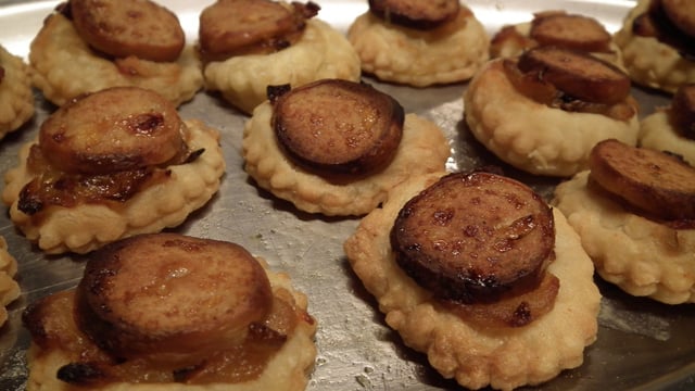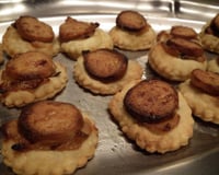 Déposez un peu de moutarde sur la pâte, puis une cuillère à café de confit et déposer une rondelle de boudin blanc sur le dessus.