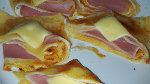 La couper en 4 triangles égaux. Déposer un peu de jambon et de fromage sur chaque moitié de triangle en laissant 1cm sur les bords.
