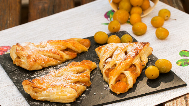 Déposez les mirabelles confites sur chaque tranche de pâte feuilletée.