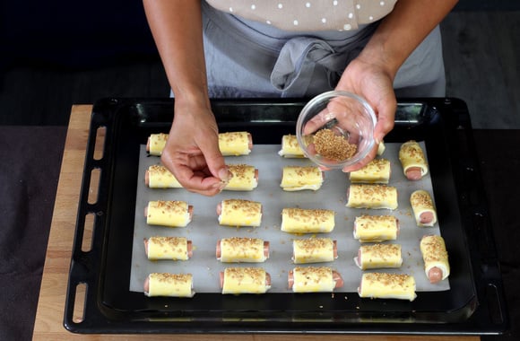 8Saupoudrez de graines de sésame, enfournez et faites cuire 20 minutes dans le four préchauffé à 180°C. Dégustez.