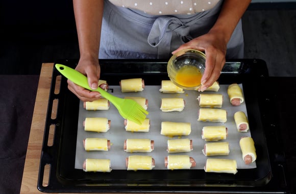 7Déposez les boudins sur la plaque du four où vous aurez étalé du papier sulfurisé, puis badigeonnez-les de jaune d'oeuf.