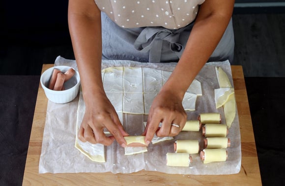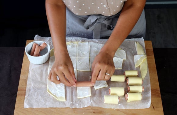 5Déposez un morceau de saucisse sur chaque rectangle de pâte feuilletée.
