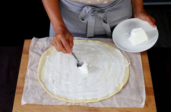 2Déroulez la pâte feuilletée puis badigeonnez-la de fromage de chèvre.