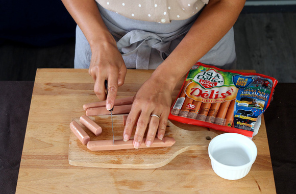1Découpez les saucisses Knack Isla Délice en 3 morceaux.