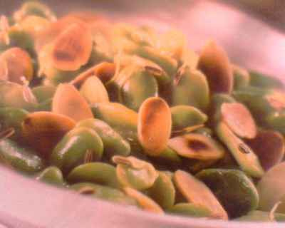 - Melanger les fèves egouttées et les oignons avec la vinaigrette .Mettre dans un plat parsemer d'amandes et de graines de cumin .