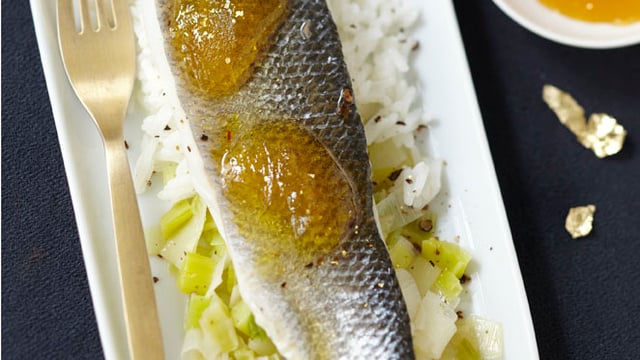 Enlevez les arêtes des filets de bar, assaisonnez-les de sel. Cuisez-les à la vapeur environ 8 minutes. Le temps de cuisson varie en fonction de l'épaisseur des filets : il faut que la chair du poisson soit laiteuse, nacrée. Quand le poisson est cuit, dressez immédiatement dans les assiettes chaudes et décorez les filets d'une cuillère à soupe de confit de vin. Servez avec un riz thaï et une fondue de poireaux légèrement safranée.