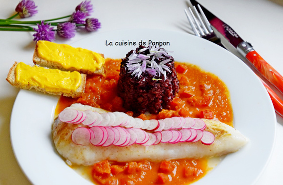2Pendant ce temps préparer le riz noir. Laver et couper en fines tranches les radis. Dans un poêlon, verser la sauce américaine et ajouter la demi tomate coupées en dés. Laisser cuire quelques minutes. Servir chaque filet de cabillaud recouvert de tranches de radis entourés de sauce américaine avec le riz noir et quelques toasts nappés de rouille.