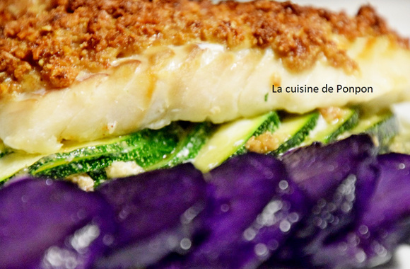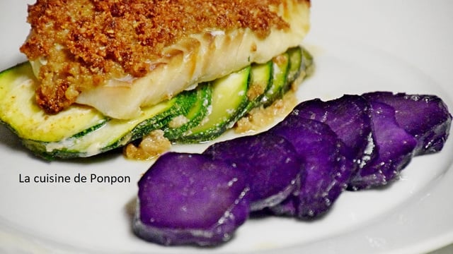 Un délicieux poisson bien accompagné ! Dans mon potager, il est revenu quelques vitelottes de l'année passée. Je les ai laissé pousser et j'ai eu quelques belles petites pommes de terre toute violettes. C'est très joli dans l'assiette!