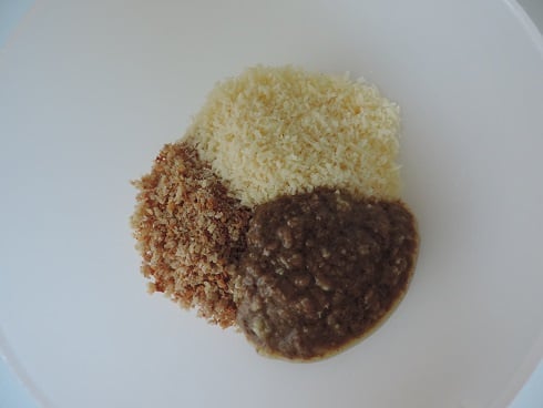 1Dans un bol, mélanger la bagna cauda avec le parmesan, l'emmental et la chapelure. Ajouter un filet d'huile d'olive. Réserver.