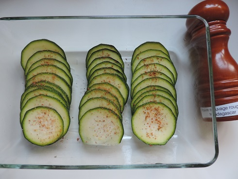 2Laver et couper les courgettes en fines rondelles. Réserver. Beurrer un plat à gratin et disposer les rondelles de courgettes sur 3 largeurs (si 3 filets de cabillaud!). Poivrer et saler les courgettes.