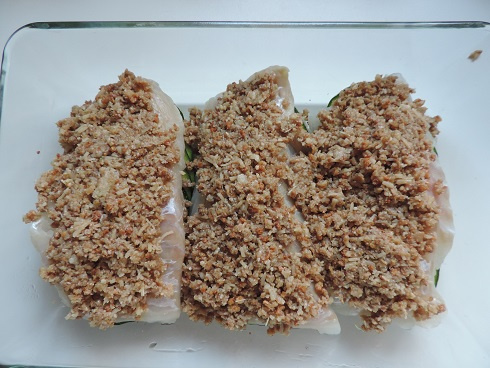 3Disposer les filets de poisson sur les courgettes. Garnir les filets de bagna cauda préparée.