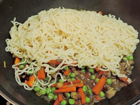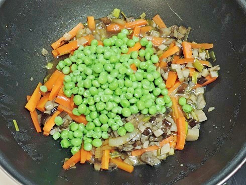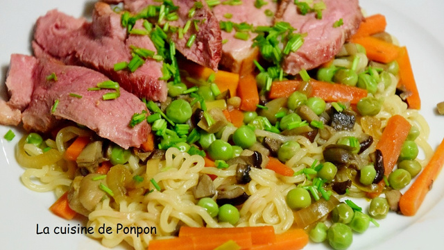2Ajouter les petits pois, les nouilles et mélanger (la recette faite cuire les nouilles selon les indications du paquet). Sortir la viande du four, la couper et la présenter avec le contenu du wok.