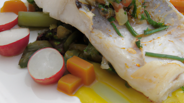 Au moment de servir, disposer les légumes au centre d'une assiette creuse, déposer un filet dessus. Filtrer la sauce avant de napper les filets.