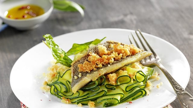 Dresser les courgettes en assiette, ajouter le poisson puis parsemer de crumble.