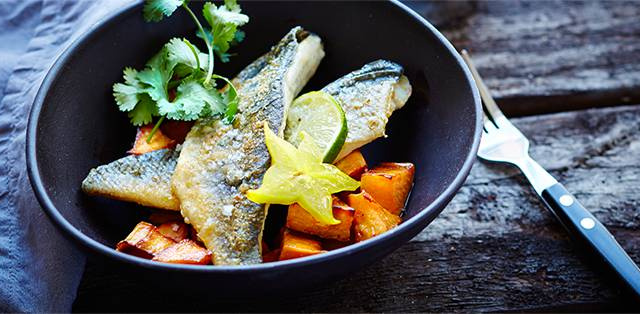 Servir avec des cubes de patates douces rôties dans de l’huile pendant 10 min et parsemer le tout de coriandre fraîche et de fleur de sel Le Saunier de Camargue.