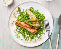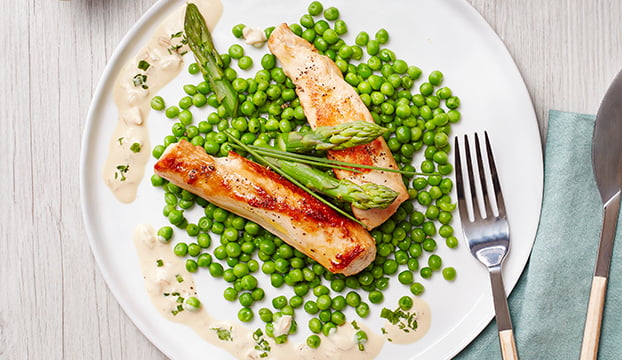 Pendant ce temps, faites cuire les pointes d'asperges et les petits pois à la vapeur pendant 5 minutes.