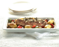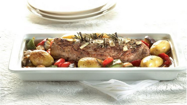 Entre-temps salez et poivrez le filet de porc; ajoutez un peu de noix de muscade. Faites saisir brièvement de tous côtés dans une poêle à feu vif. Mettez le filet dans un récipient ou plat en porcelaine, et piquez la viande de branches de romarin. Saupoudrez parcimonieusement de fleur de sel et arrosez de miel d'acacia. Décorez avec les tomates confites. Couvrez soigneusement d'un film alimentaire non perforé et résistant à la chaleur. Couvrez le plat de légumes et mettez le filet de porc au-dessus. Faites cuire pendant 20 minutes à 90°C.
