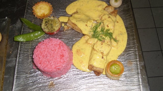 Dresser dans une assiette en nappant de sauce safran..accompagné d'une timbale de riz ou de semoule.