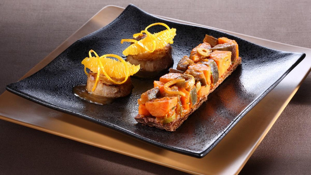 Dresser l'assiette avec la viande saucée, les suprêmes d'orange tiédis au micro-ondes 30 secondes puissance maximum et le Tajine bien chaud sur chaque rectangle de pâte feuilletée.