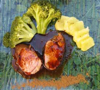 Filet mignon caramélisé au gingembre, soja et poivre vert.
