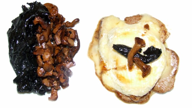 Dresser votre assiette avec la viande recouverte de St Marcellin fondant surmonté d'une trompette de la mort et d'une girolle et accompagnée des champignons.