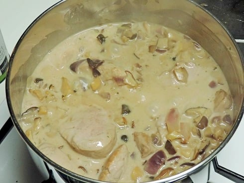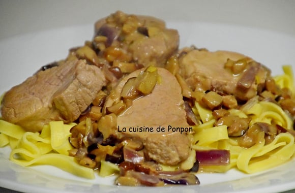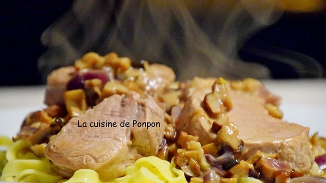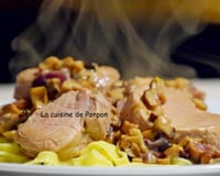 Un plat délicieux avec une viande fondante et puis avec des champignons de notre bois et des oignons du potager !