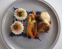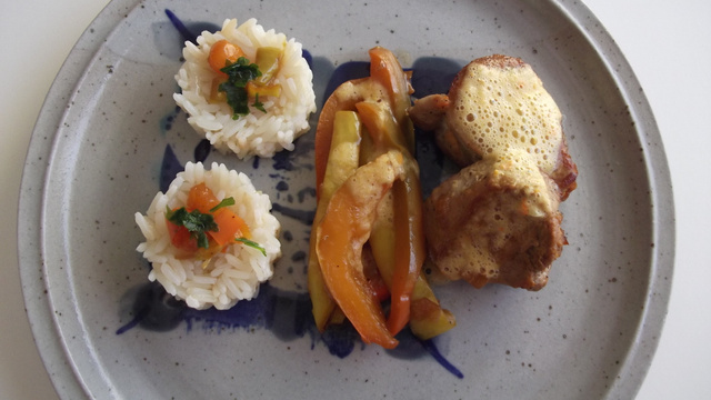 Couper le filet mignon en médaillons et saler/poivrer. Faire revenir les médaillons dans un fait-tout dans un peu d'huile d'olive (10 minutes environ) puis retirer du feu et réserver. Dans le même fait-tout, faire revenir 1 oignon émincé et deux poivrons en lamelles. Lorsque les poivrons et les oignons sont cuits, déglacer au vin blanc et vinaigre balsamique. Réserver.