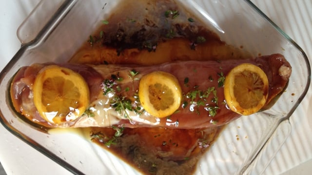 Mettre le filet dans un plat allant au four, arrosez de miel et d'herbes. Recouvrir de tranches de citron et arrosez avec le jus qui reste... laissez mariné en arrosant régulièrement pendant au moins 3h.