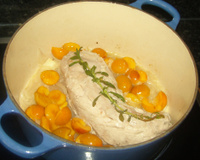 Les 15 min se sont écoulées. Déglacez au vin blanc et ajoutez les mirabelles. Laissez cuire à nouveau 15 min.