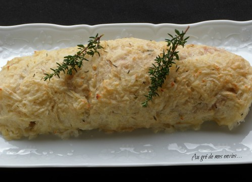 Mettre le restant de farine dans une assiette avec le thym émietté et y rouler le filet mignon. Le poser dans le plat et le recouvrir entièrement avec la pâte de pommes de terre en appuyant pour bien faire adhérer.