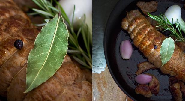 Pour la préparation du filet mignon, commencer par parer la viande. Il reste en une longe que j'ai coupée en petits morceaux. Inciser dans le sens de la longueur assez profondément mais attention, il faut y aller doucement, la viande est très tendre. Déposer dans l'incision 2 c à s d'airelles égouttées puis le foie gras en petits morceaux. Assaisonner de poivre de Sichuan concassé (environ une cuillère à soupe, j'ai pris le parti de ne pas saler à ce stade, mais c'était peut-être un tord), ficeler le filet mignon. Faire colorer le filet ainsi que les petits morceaux de reste de viande dans une cocotte en fonte avec un peu d'huile d'olive. Ensuite, ajouter un oignon nouveau et échalotes que j'ai laissé entiers pour garder un peu de craquant à la dégustation, le romarin, le laurier et les baies de genièvre.