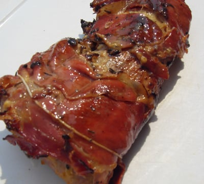 Un filet mignon cuit au barbecue enrobé de moutarde fine et forte et bardé de jambon de Bayonne
