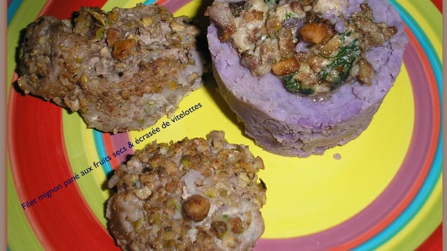 Tremper les tranches de filet mignon dans l'oeuf puis les rouler dans la panure de fruits secs.