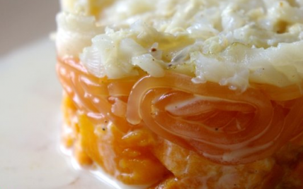 Une couche de patate douce, une couche de spaghetti, une couche de poisson.