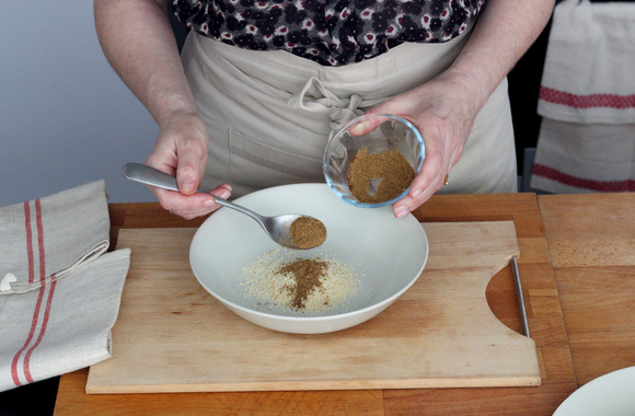 3Dans une assiette creuse, mélangez la chapelure, les épices et un peu de sel.
