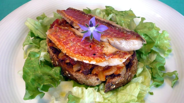 Une entrée absolument délicieuse qui fera fureur ! Des filets de rouget, une concassée de tomates-oignons, de la pâte d'olive, tout cela sur du bon pain aux céréales, accompagné d'une salade verte.