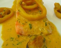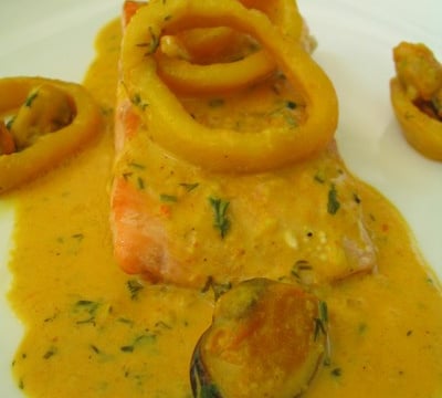 Servez les filets de saumon nappés de sauce aux fruits de mer, accompagnés de riz blanc, de pommes de terre vapeur....
