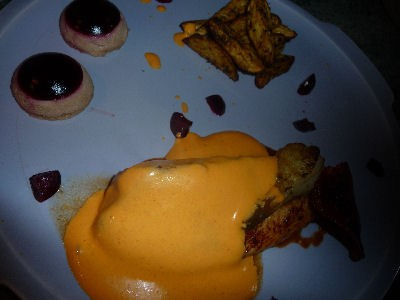 - 6Dressage :Sur un cordon de marinade réduite, placer un filet de Tilapia sur lequel on déposera au siphon de la Mousse de Chorizo, accompagner de quelques potatoes et de 2 bouchées Cerise-Cola. Disposer une chips de chorizo réalisée au four porte ouverte