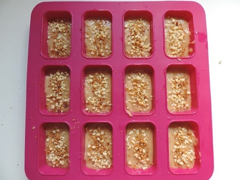 4Verser dans les moules choisis. Parsemer d'amandes concassées et de pralin. Enfourner dans un four préchauffé à 210° pendant 15min.