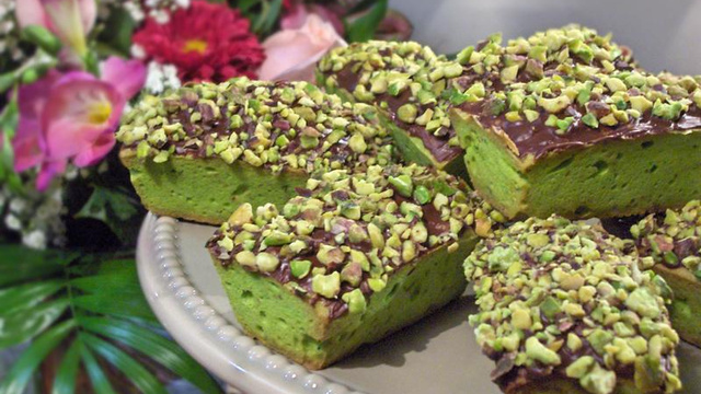 A l'aide d'un pinceau, badigeonner le dessus de chaque financier avec le nappage au chocolat et les imprégner de suite de pistaches concassées.