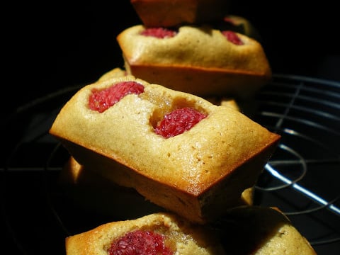 Remplir les moules en silicone aux trois quarts ajouter 2 framboises par financier et enfourner pour 12 min.