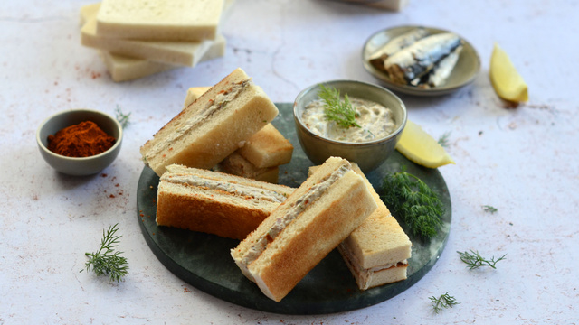 Toastez légèrement les tranches de pain de mie. Posez 4 tranches sur le plan de travail et tartinez-les avec les rillettes de sardine. Recouvrez avec les tranches restantes et coupez chaque sandwich en 4 longs rectangles.