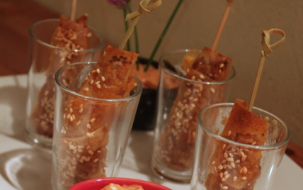 Piquer chaque finger avec un pique en bambou et servir chaud avec une sauce yaourt/citron ou yaourt/tomates séchées mixées (assaisonnée poivre/sel).