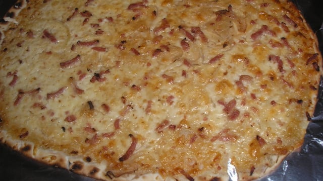 - 3Recouvrez d'oignons émincés, de lardons, de crème.Assaisonnez. Arrosez ce mélange d'huile.Enfournez pendant 15 minutes.Dégustez chaude.Bon appétit !