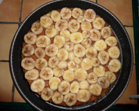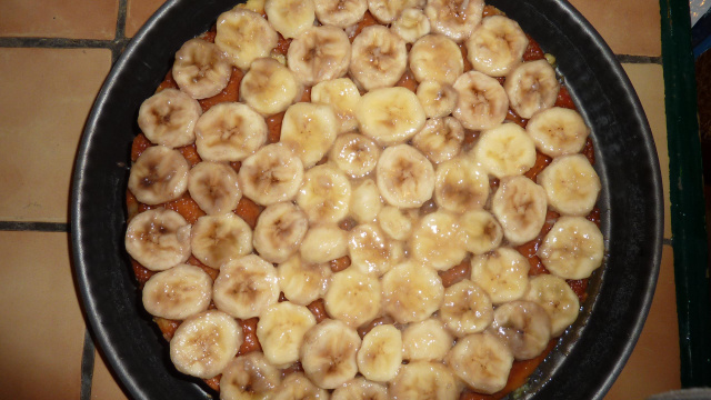 Enfin garnir le gâteau avec les bananes restantes coupées en tranches et préalablement macérées dans le rhum.