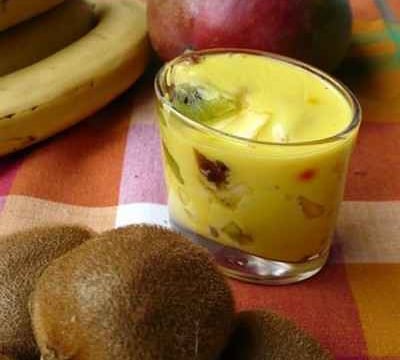 - Déposer les dés de fruits dans de petits bols ou dans des verrines puis recouvrir de la préparation au lait de coco
