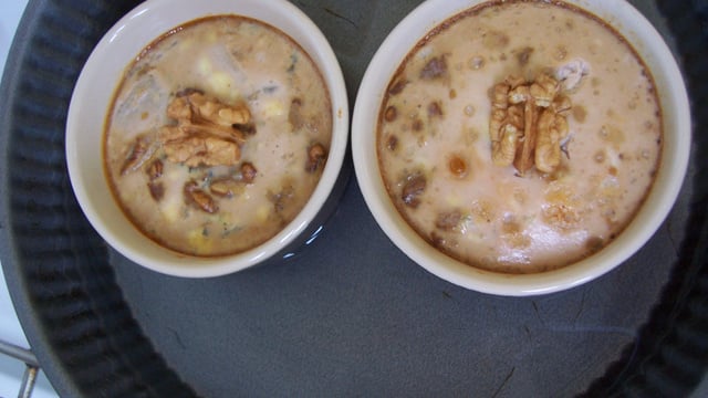 Ajoutez les cerneaux de noix concassés - prendre soin d'en garder 4 beaux pour la décoration - au lait chaud et versez ensuite ce mélange sur les oeufs battus.